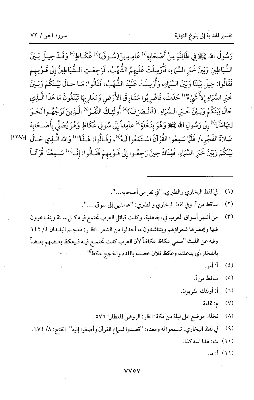 رَسُولُ الله A فِي طَائِفَةٍ مِنْ أَصْحَابِهِ عَامِدِينَ (سُوقَ) عُكَاضٍ وَقَدْ حِيلَ بَيْنَ الشَّيَاطِينِ وَبَيْنَ خَبَرِ السَّمَاءِ، فَأُرْسِلَتْ عَلَيهِمُ الشُّهُبُ، فَرَجِعَتِ الشَّيَاطِينُ إِلَى قَوْمِهِمْ فَقَالُوا: حِيلَ بَيْنَنَا وَبَيْنَ السَّمَّاءِ، وَأُرْسِلَتْ عَلَيْنَا الشُّهُبُ، فَقَالُوا: مَا حالَ بَيْنكُمْ وَبَيْنَ خَيبَرِ السَّمَاءِ إِلاَّ شَيْءٌ حَدَثَ، فَاضْرِبُوا مَشَارِقَ الأَرْضِ وَمَغَارِبِهَا تَبْتَغُونَ مَا هَذَا الَّذِي حَالَ بَيْنَكُمْ وَبَيْنَ خَبَرِ السَّمَاءِ. (فَانْصَرَفَ) أُولَئِكَ النَّفَرُ الَّذِينَ تَوَجَّهُوا نَحْوَ [تهَامَةَ] إِلَى رَسُولِ اللهِ A وَهُوَ بِنَخْلَةٍ عَامِداً إِلَى سُوقِ عُكَاظٍ وَهُوَ يُصَلِّي بِأَصْحَابِهَ صَلاَةَ الفَجْرِ، / فَلَمَّا سَمِعُوا القُرْآنَ اسْتَمَعُوا لَهُ، وَقَالُوا: هَذَا وَالله الَّذِي حَالَ بَيْنَكُمْ وَبَيْنَ خَبَرِ السَّمَاءِ. فَهُنَاكَ حِينَ رَجِعُوا إِلَى قَوْمِهِمْ فَقَالُوا: إِنَّا سَمِعْنَا قُرْآناً
