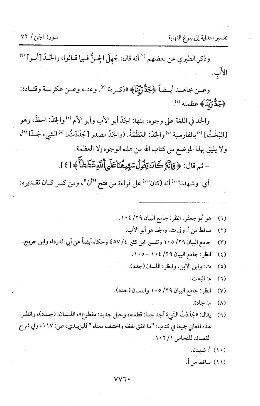 والجد في اللغة على وجوه، منها: الجَدّ أبو الأب وأبو الأم والجَدّ: الحظّ، وهو [البَخْتُ] بالفارسية والجَدّ: العَظَمَةُ. (والجَدّ مصدر [جَدَدْتُ] الشيء جَدّا، ولا يليق بهذا الموضع من كتاب الله من هذه الوجوه إلا العظمة.