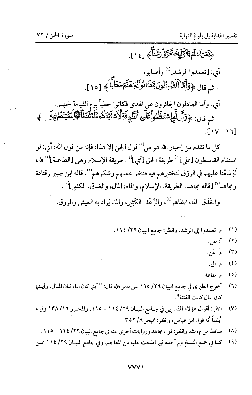 كل ما تقدم من إخبار الله هو من قول الجن إلا هذا، فإنه من قول الله، أي: لو استقام القاسطون [على] طريقة الحق [أي]: طريقة الإسلام وهي [الطاعمة] لله، لَوَسّعْنا عليهم في الرزق لنختبرهم فيه فننظر عملهم وشكرهم. قاله ابن جبير وقتادة ومجاهد [قاله مجاهد: الطريقة: الإسلام، والماء: المال، والغدق: الكثير].