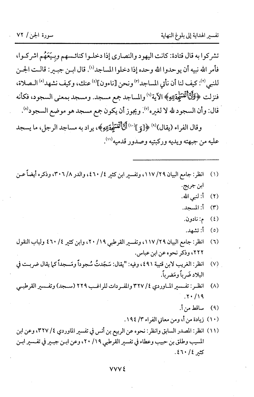 وقال الفراء (يقال) {[وَ] أَنَّ المساجد لِلَّهِ}، يراد به مساجد الرجل، ما يسجد عليه من جبهته ويديه وركبتيه وصدور قدميه.