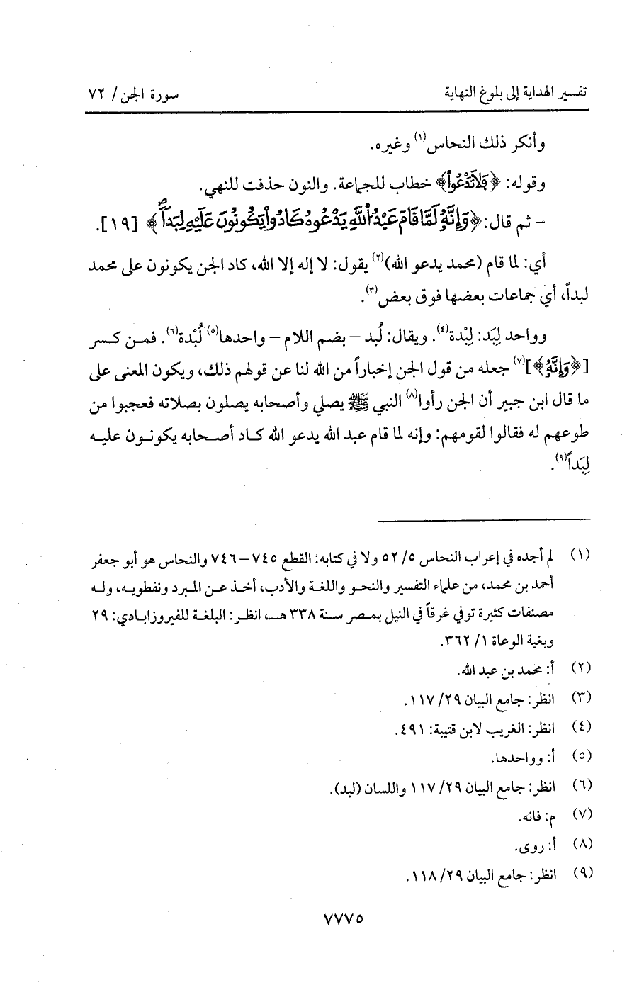 فمن كسر [{وَأَنَّهُ}] جعله من قول الجن إخباراً من الله لنا عن قولهم ذلك، ويكون المعنى على ما قال ابن جبير أن الجن رأوا النبي A يصلي وأصحابه يصلون بصلاته فعجبوا من طوعهم له فقالوا لقومهم: وإنه لما قام عبد الله يدعو الله كاد أصحابه يكونون عليه لِبَداً.