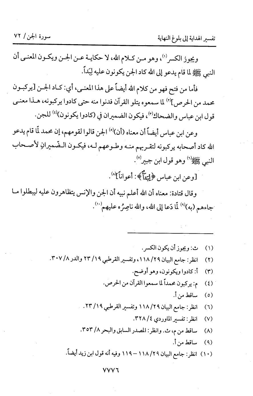 وعن ابن عباس أيضاً أن معناه (أن) الجن قالوا لقومهم، إن محمد لمّا قام يدعو الله كاد أصحابه يركبونه لتقربهم منه وطوعهم له، فيكون الضّميرانِ لأصحابِ النبي A وهو قول ابن جبير.