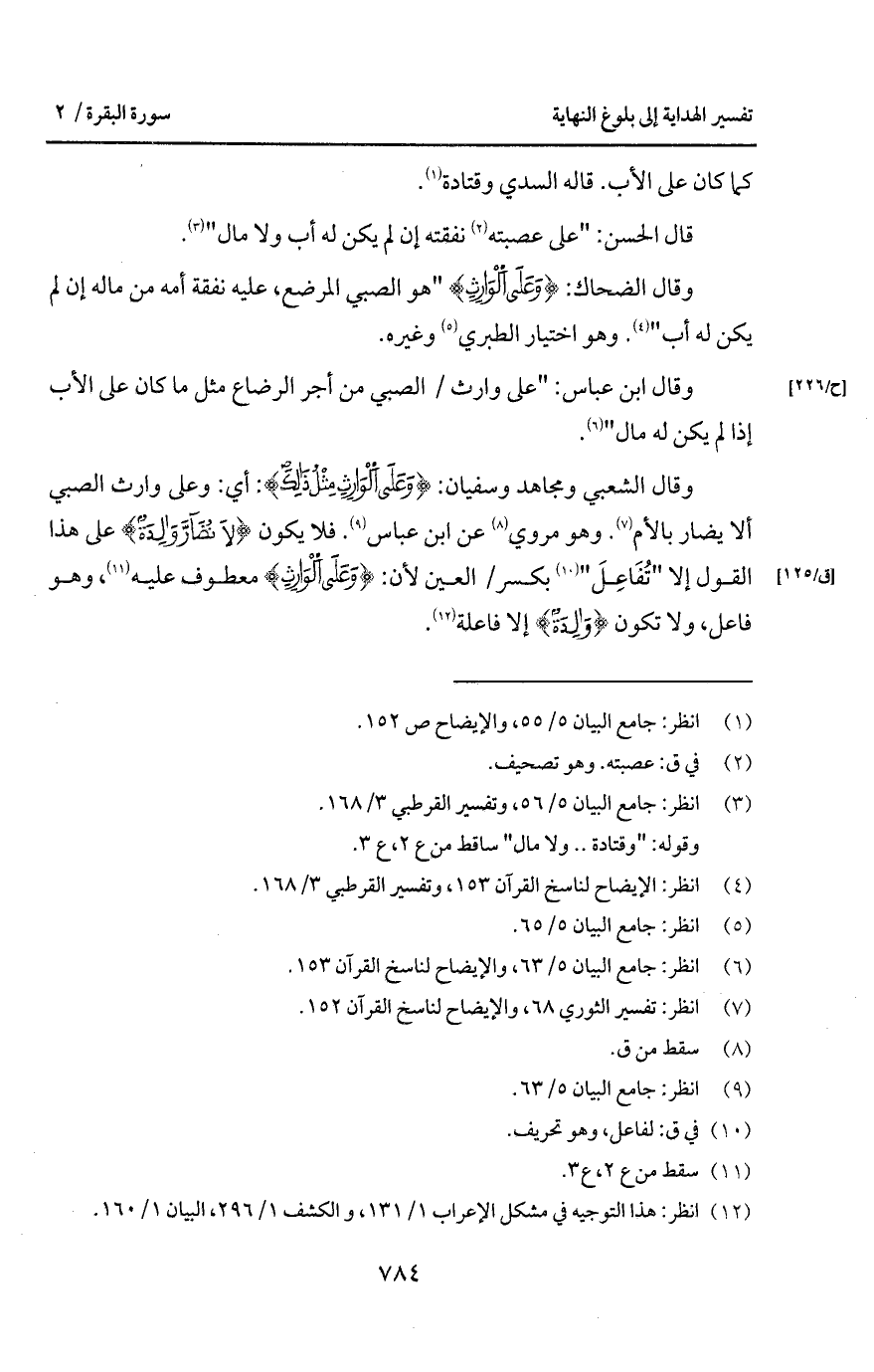وقال الشعبي ومجاهد وسفيان: {وَعَلَى الوارث مِثْلُ ذلك}: أي: وعلى وارث الصبي ألا يضار بالأم. وهو مروي عن ابن عباس. فلا يكون {لاَ تُضَآرَّ وَالِدَةٌ} على هذا القول إلا " تُفَاعِلَ " بكسر / العين لأن: {وَعَلَى الوارث} معطوف عليه، وهو فاعل، ولا تكون {وَالِدَةٌ} إلا فاعلة.