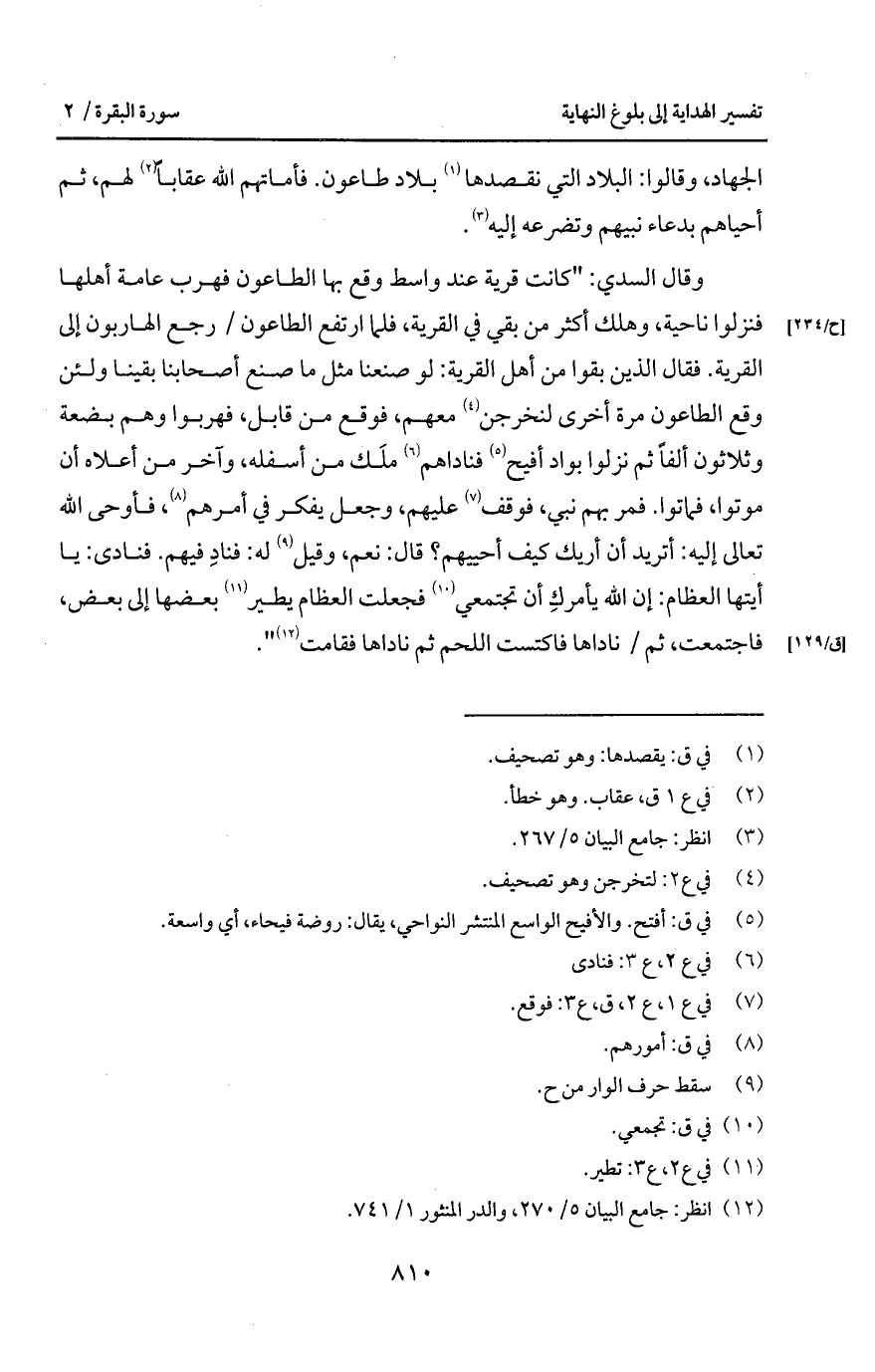 وقال السدي: " كانت قرية عند واسط وقع بها الطاعون فهرب عامة أهلها فنزلوا ناحية، وهلك أكثر من بقي في القرية، فلما ارتفع الطاعون/ رجع الهاربون إلى القرية. فقال الذين بقوا من أهل القرية: لو صنعنا مثل ماصنع أصحابنا بقينا ولئن وقع الطاعون مرة أخرى لنخرجن معهم، فوقع من قابل، فهربوا وهم بضعة وثلاثون ألفاً ثم نزلوا بواد أفيح فناداهم ملَك من أسفله، وآخر من أعلاه أن موتوا، فماتوا. فمر بهم نبي، فوقف عليهم، وجعل يفكر في أمرهم، فأوحى الله تعالى إليه: أتريد أن أريك كيف أحييهم؟ قال: نعم، وقيل له: فنادِ فيهم.