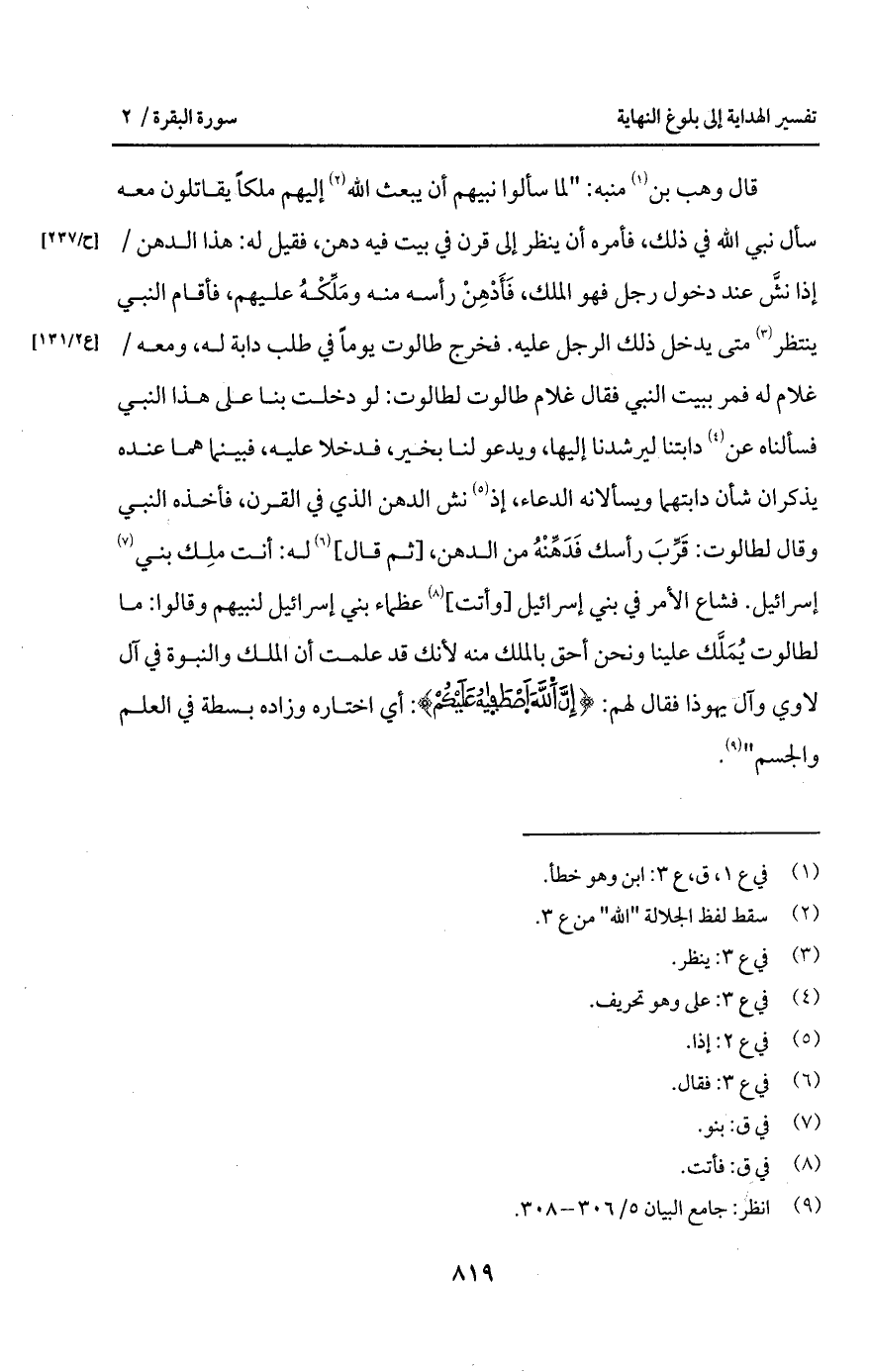 قال وهب بن منبه: " لما سألوا نبيهم أن يبعث الله إليهم ملكاً يقاتلون معه سأل نبي الله في ذلك، فأمره أن ينظر إلى قرن في بيت فيه دهن، فقيل له: هذا الدهن/ إذا نشَّ عند دخول رجل فهو الملك، فَأَدْهِنْ رأسه منه ومَلَّكْهُ عليهم، فأقام النبي ينتظر متى يدخل ذلك الرجل عليه. فخرج طالوت يوماً في طلب دابة له، ومعه/ غلام له فمر ببيت النبي فقال غلام طالوت لطالوت: لو دخلت بنا على هذا النبي فسألناه عن دابتنا ليرشدنا إليها، ويدعو لنا بخير، فدخلا عليه، فبينما هما عنده يذكران شأن دابتهما ويسألانه الدعاء، إذ نش الدهن الذي في القرن، فأخذه النبي وقال لطالوت: قَرِّبَ رأسك فَدَهِّنْهُ من الدهن، [ثم قال] له: أنت ملِك بني إسرائيل. فشاع الأمر في بني إسرائيل [وأتت] عظماء بني إسرائيل لنبيهم وقالوا: ما لطالوت يُمَلَّك علينا ونحن أحق بالملك منه لأنك قد علمت أن الملك والنبوة في آل لاوي وآل يهوذا فقال لهم: {إِنَّ الله اصطفاه عَلَيْكُمْ}: أي اختاره وزاده بسطة في العلم والجسم ".