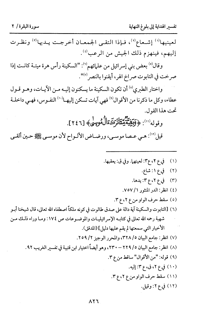 واختار الطبري أن تكون السكينة ما يسكنوه إليه من الآيات، وهو قول عطاء، وكل ما ذكرنا من الأقوال فهي آيات تسكن إليها النفوس، فهي داخلة تحت هذا القول.