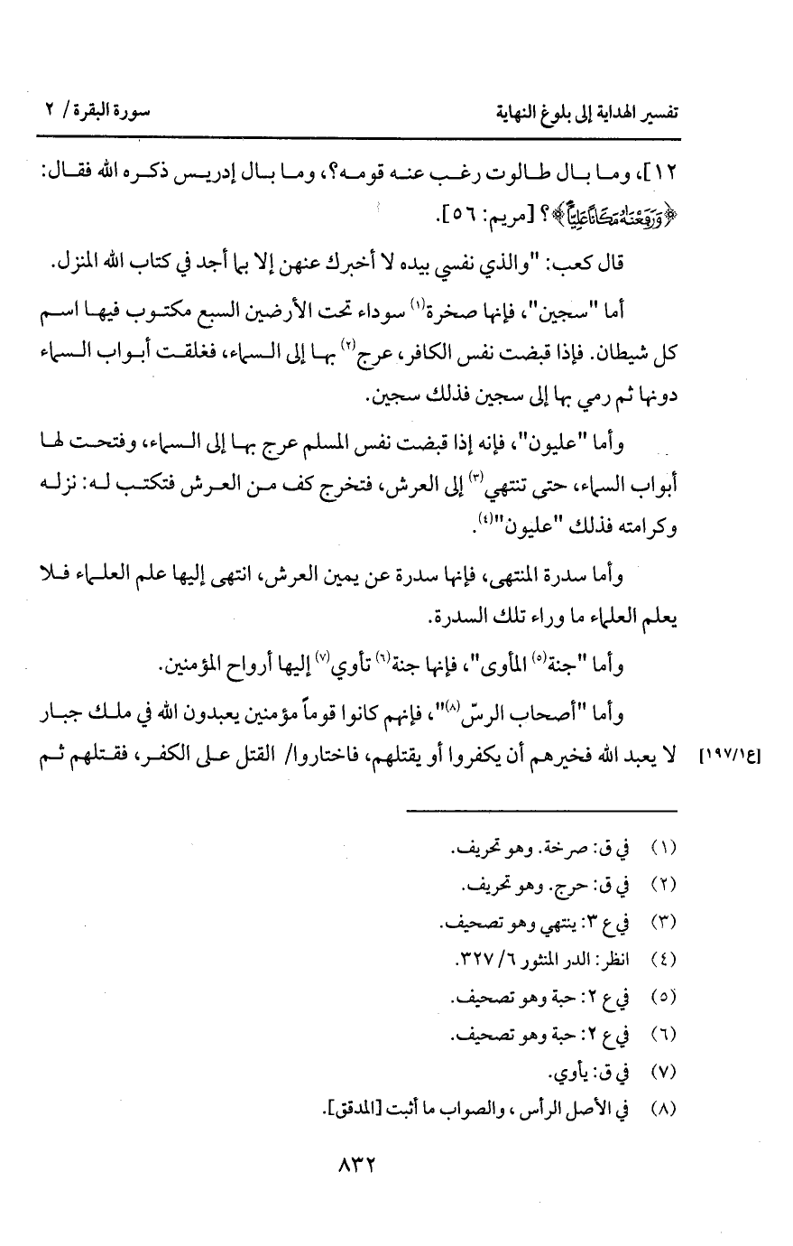 وأما " عليون "، فإنه إذا قبضت نفس المسلم عرج بها إلى السماء، وفتحت لها أبواب السماء، حتى تنتهي إلى العرش، فتخرج كف من العرش فتكتب له: نزله وكرامته فذلك " عليون ".