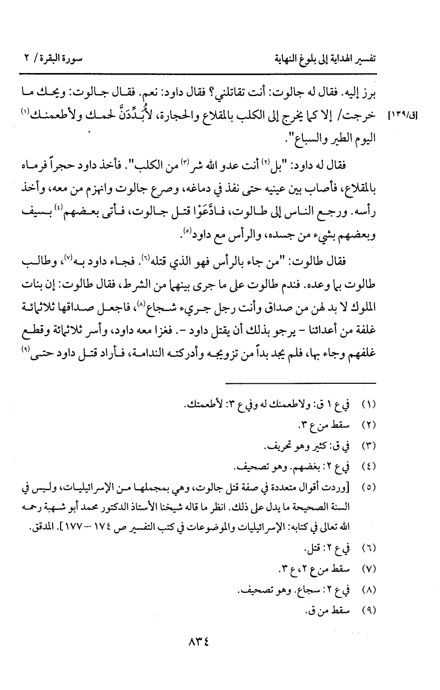 برز إليه. فقال له جالوت: أنت تقاتلني؟ فقال داود: نعم. فقال جالوت: ويحك ما خرجت/ إلا كما يخرج إلى الكلب بالمقلاع والحجارة، لأُبَدِّدَنَّ لحمك ولأطعمنك اليوم الطير والسباع ".