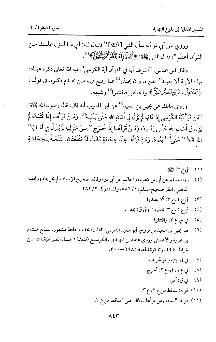 وروى مالك عن يحيى بن سعيد عن ابن المسيب أنه قال: قال رسول الله A: " مَنْ قَرَأَ آيَةَ الكُرْسِي إِذَا نَامَ، لَمْ يَزَلْ فِي أَمَانِ الله حَتَّى يَنْتَبِهَ. وَمَنْ قَرَأَهَا إِذَا انْتَبَهَ، لَمْ يَزَلْ فِي أَمَانِ الله حَتَّى يَعُودَ، وَمَنْ قَرَأَهَا إِذَا خَرَجَ مِنْ مَنْزِلِهِ لَمْ يَزَلْ فِي أَمَانِ اللهِ D حَتَّى يَعُودَ. وَمَنَ قَرَأَهَا عِنْدَ حِجَامَةٍ كَانَتْ لَهُ مَنْفَعَتَانِ: مَنْفَعَةٌ لِلْحِجَامَةِ الَّتِي هُوَ فِيهَا، وَمَنْفَعَةٌ لِلْحِجَامَةِ