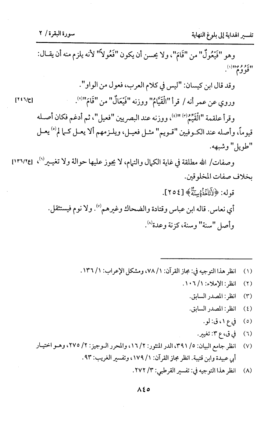 وقرأ علقمة " الْقَيِّمُ "، ووزنه عند البصريين " فعيل "، ثم أدغم فكان أصله قيوماً، وأصل عند الكوفيين " قويم " مثل فعيل، ويلزمهم ألا يعل كما لم يعل " طويل " وشبهه.