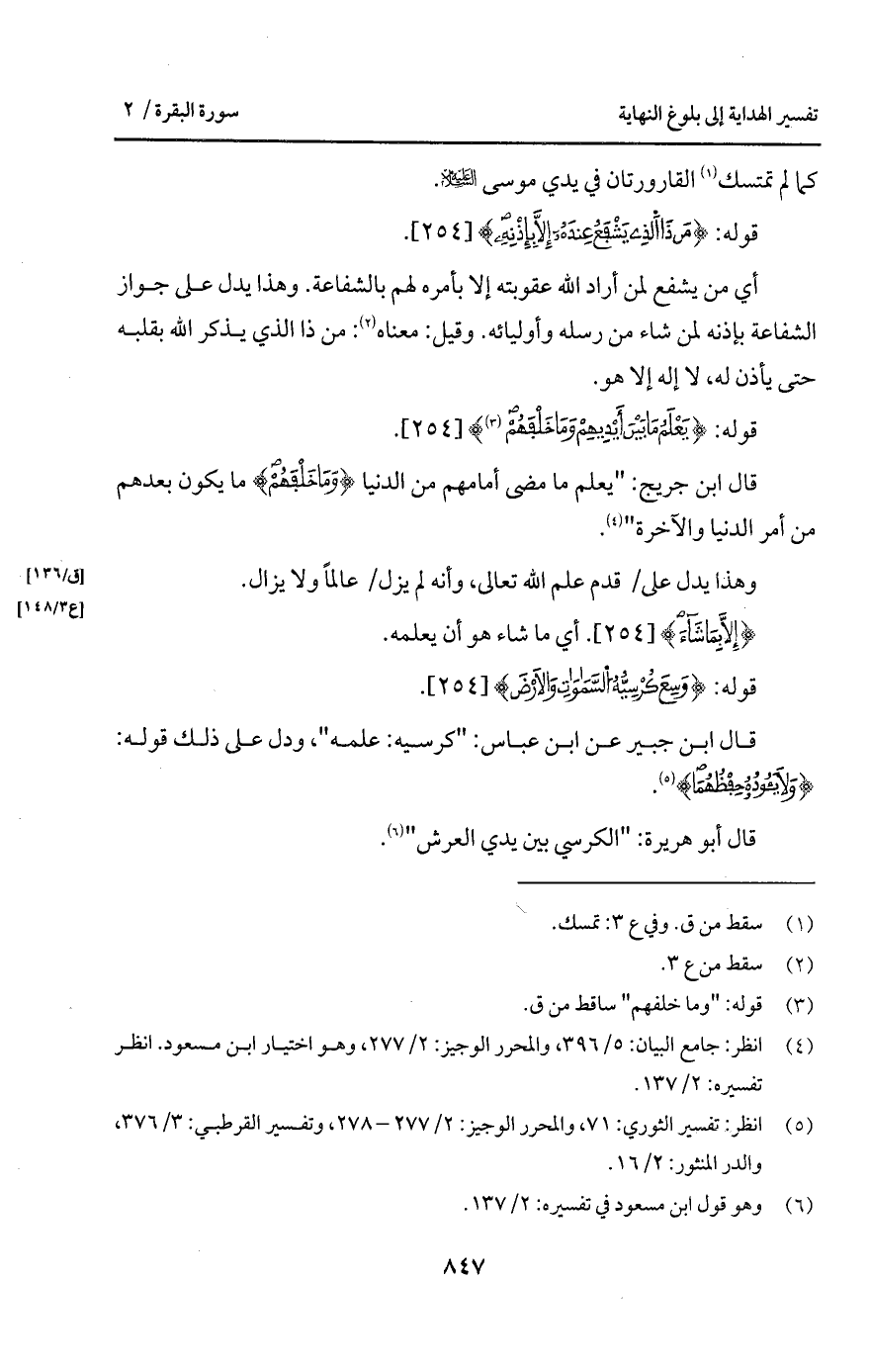 قال ابن جبير عن ابن عباس: " كرسيه: علمه "، ودل على ذلك قوله: {وَلاَ يَؤُودُهُ حِفْظُهُمَا}.