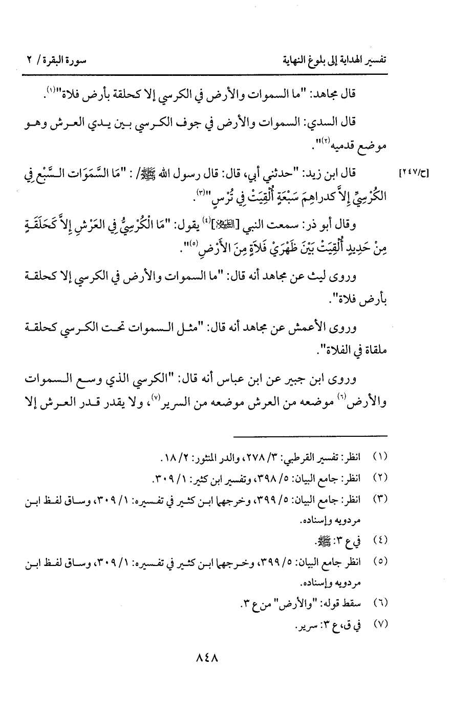 قال ابن زيد: " حدثني أبي، قال: قال رسول الله A /: " مَا السَّمَوات السَّبْع فِي الكُرْسِيِّ إِلاَّ كدرَاهِمَ سَبْعَةٍ أُلْقِيَتْ فِي تُرْسٍ ".