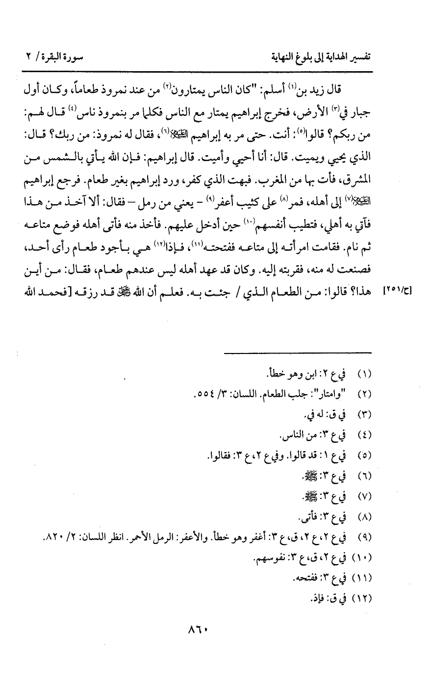 قال زيد بن أسلم: " كان الناس يمتارون من عند نمروذ طعاماً، وكان أول جبار في الأرض، فخرج إبراهيم يمتار مع الناس فكلما مر بنمروذ ناس قال لهم: من ربكم؟ قالوا: أنت.