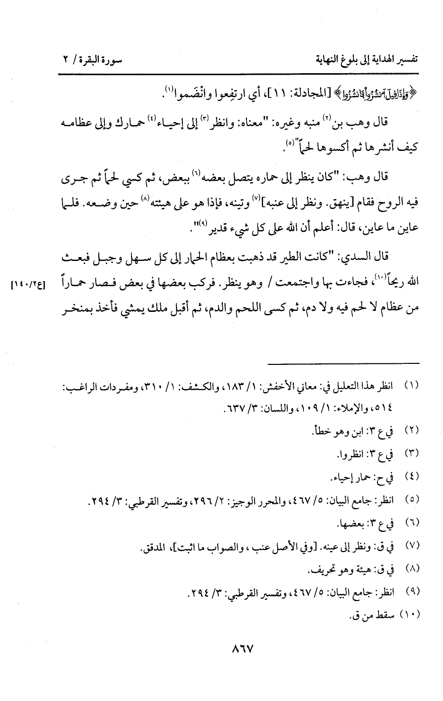 قال السدي: " كانت الطير قد ذهبت بعظام الحمار إلى كل سهل وجبل فبعث الله ريحاً، فجاءت بها واجتمعت/ وهو ينظر. فركب بعضها في بعض فصار حماراً من عظام لا لحم فيه ولا دم، ثم كسى اللحم والدم، ثم أقبل ملك يمشي فأخذ بمنخر