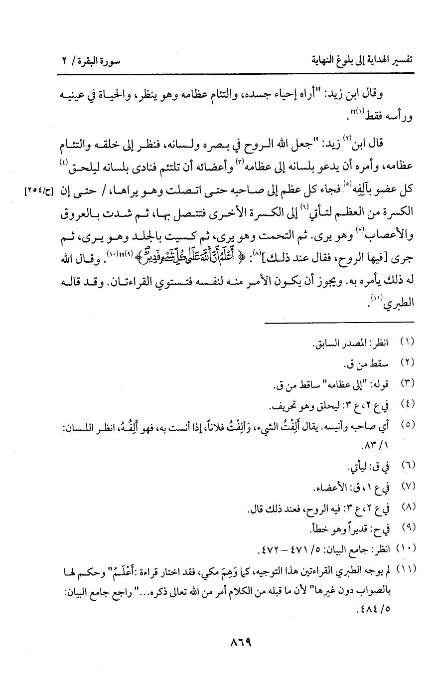 قال ابن زيد: " جعل الله الروح في بصره ولسانه، فنظر إلى خلقه والتئام عظامه، وأمره أن يدعو بلسانه إلى عظامه وأعضائه أن تلتئم فنادى بلسانه ليلحق كل عضو بآلِفِه فجاء كل عظم إلى صاحبه حتى اتصلت وهو يراها، / حتى إن الكسرة من العظم لتأتي إلى الكسرة الأخرى فتتصل بها، ثم شدت بالعروق والأعصاب وهو يرى.