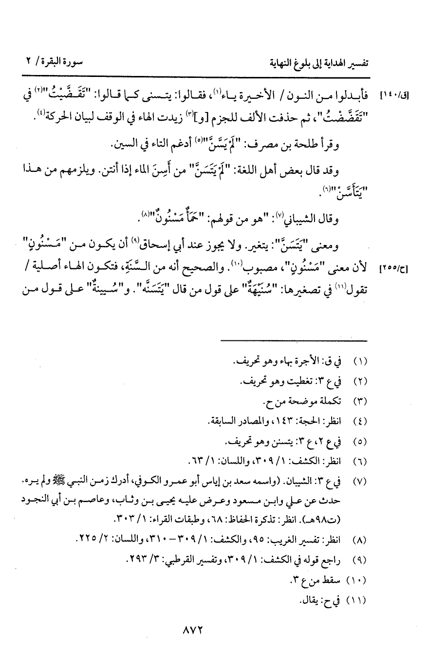 ومعنى " يَتَسَنَّ ": يتغير. ولا يجوز عند أأبي إسحاق أن يكون من " مَسْنُونٍ " لأن معنى " مَسْنُونٍ "، مصبوب. والصحيح أنه من السَّنَةِ، فتكون الهاء أصلية/ تقول في تصغيرها: " سُنَيْهَةٌ " على قول من قال: " يَتَسَنَّه ". و " سُيينةٌ " على قول من
