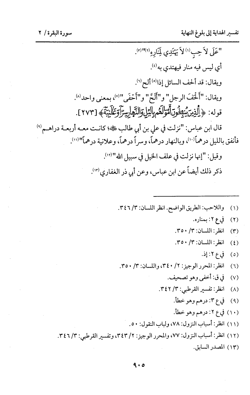 قال ابن عباس: " نزلت في علي بن أبي طالب Bهـ؛ كانت معه أربعة دراهم فأنفق بالليل درهماً. وبالنهار درهماً، وسراص درهماً، وعلانية درهماً ".