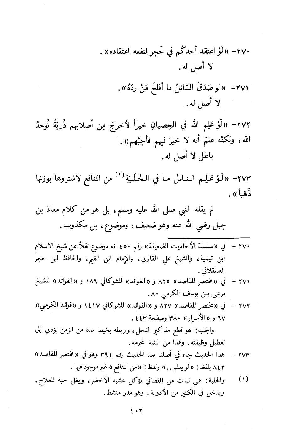 277 - " لَو يعلم النَّاس مَا فِي الحلبة لاشتروها وَلَو بوزنها ذَهَبا ". مَوْضُوع، مَكْذُوب.