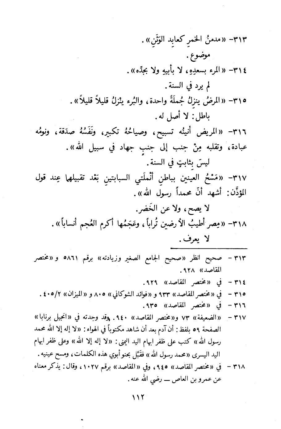 321 - " الْمعدة بَيت الدَّاء، وَالْحمية رَأس الدَّوَاء ". لم يقلهُ النَّبِي صلى الله عَلَيْهِ وَسلم، بل هُوَ كَلَام الْحُكَمَاء والعامة ".