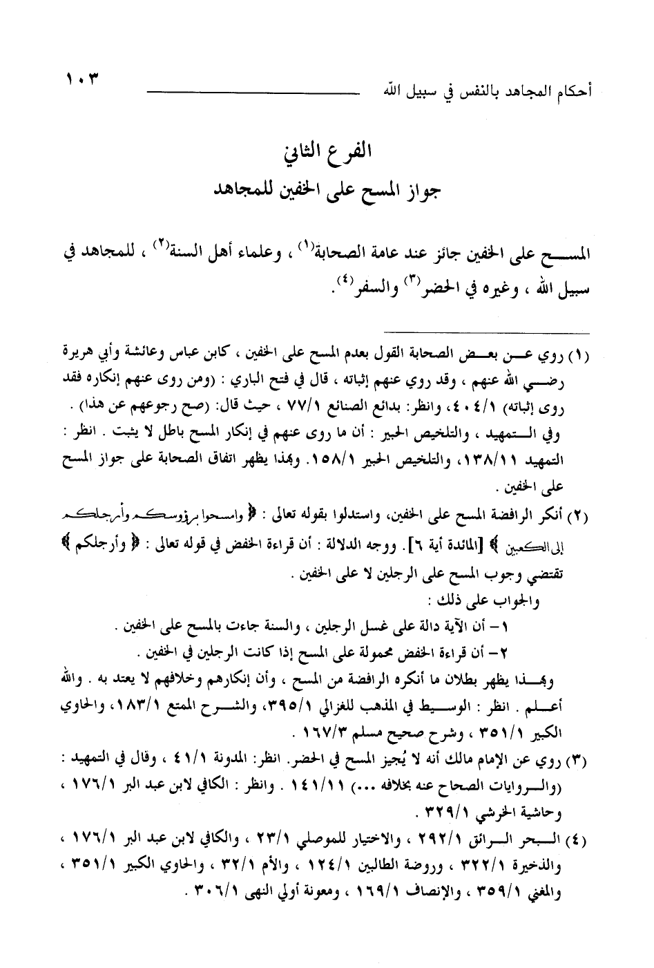 (¬3) روي عن الإمام مالك أنه لا يجيز المسح في الحضر انظر المدونة (1/41) وقال في التمهيد: (والروايات الصحاح عنه بخلافه) (11/141) وانظر: الكافي لابن عبد البر ... (1/176) وحاشية الخرشي (1/329) .