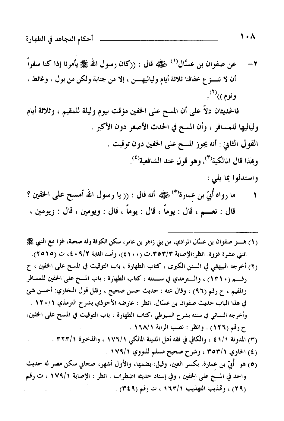 (¬2) أخرجه البيهقي في السنن الكبرى كتاب الطهارة باب التوقيت في المسح على الخفين ح رقم (1310) والترمذي في سننه كتاب الطهارة باب المسح على الخفين للمسافر والمقيم ح رقم (96) وقال عنه: حديث حسن صحيح ونقل قول البخاري: أحسن شيء في هذا الباب حديث صفوان بن عسال. انظر عارضه الأحوذي بشرح الترمذي (1/120) . وأخرجه النسائي في سننه بشرح السيوطي كتاب الطهارة باب التوقيت في المسح على الخفين، ح رقم (126) وانظر نصب الراية (1/168) .