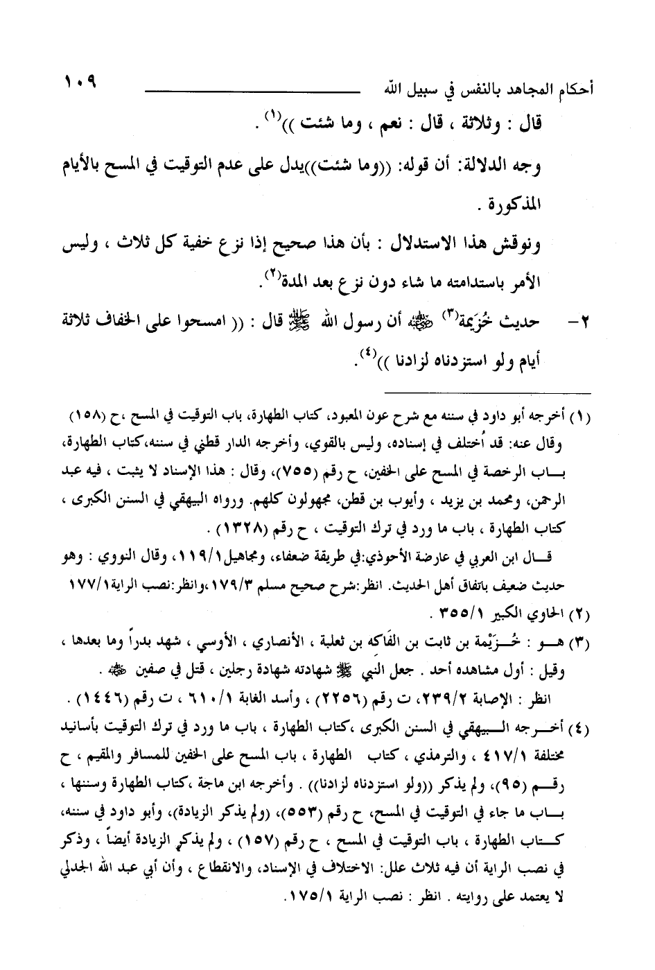 (¬4) أخرجه البيهقي في السنن الكبرى، كتاب الطهارة باب ما ورد في ترك التوقيت بأسانيد مختلفة (1/417) والترمذي كتاب الطهارة باب المسح على الخفين للمسافر والمقيم، ح رقم (95) ولم يذكر (ولو استزدناه لزادنا) وأخرجه ابن ماجه كتاب الطهارة وسننها، باب ما جاء في التوقيت في المسح، ح رقم (553) ولم يذكر الزيادة، وأبو داود في سننه، كتاب الطهارة، باب التوقيت في المسح، ح رقم (157) ولم يذكر الزيادة أيضا، وذكر في نصب الراية أن فيه ثلاثة علل: الاختلاف في الإسناد والانقطاع وأن أبي عبد الله الجدلي لا يعتمد على روايته. انظر نصب الراية (1/175) .
