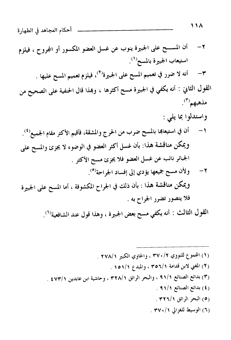 2- ولأن مسح جميعها يؤدي إلى إفساد الجراحة (¬5) . ويمكن مناقشة هذا: بأن ذلك في الجراح المكشوفة أما المسح على الجبيرة فلا يتصور تضرر الجراح به.