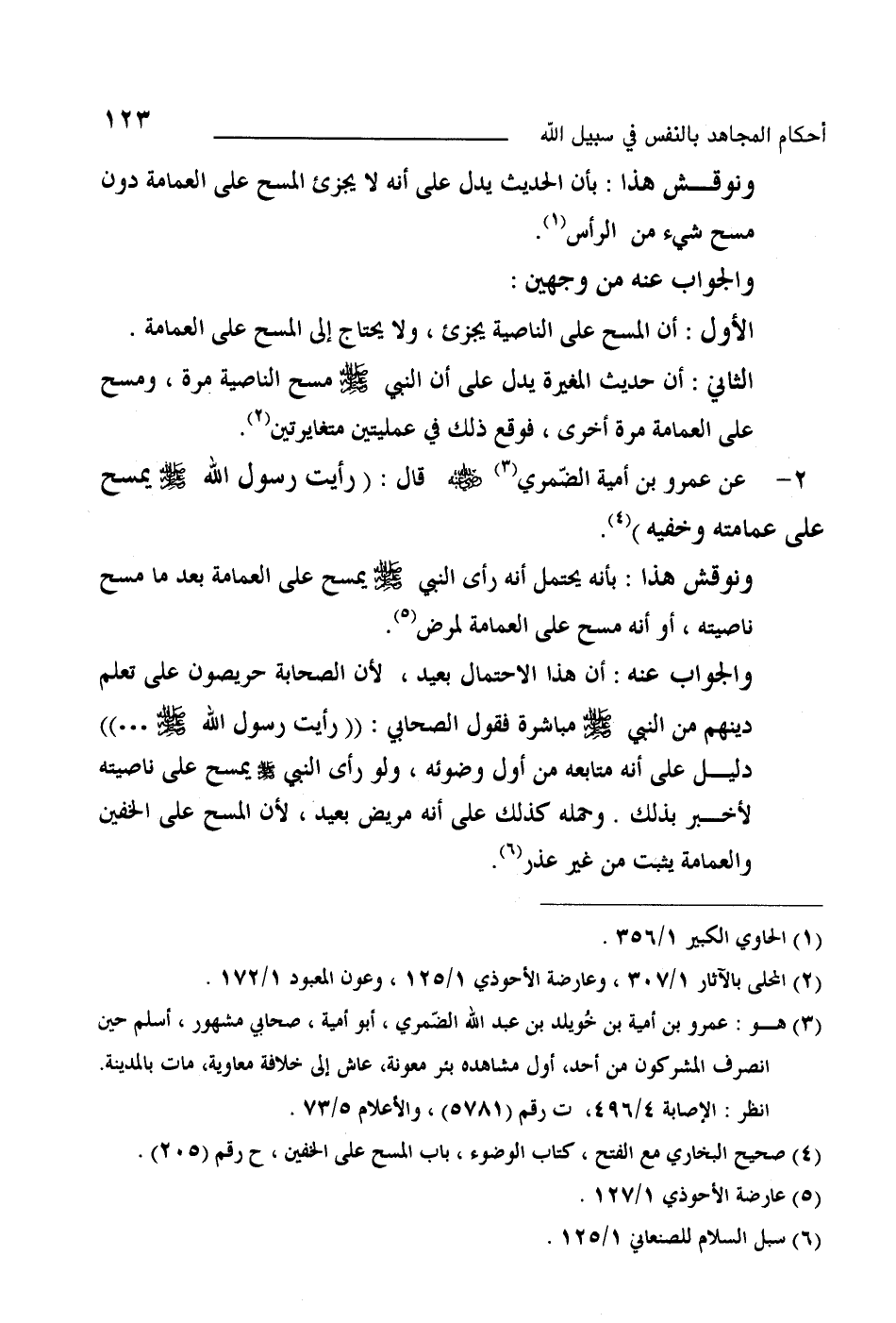 والجواب عنه: أن هذا الاحتمال بعيد، لأن الصحابة حريصون على تعلم دينهم من النبي - صلى الله عليه وسلم - مباشرة فقول الصحابي (رأيت رسول الله - صلى الله عليه وسلم -..) دليل على أنه متابعه من أول وضوئه، ولو رأى النبي - صلى الله عليه وسلم - يمسح على ناصيته لأخبر بذلك وحمله كذلك على أنه مريض بعيد، لأن المسح على الخفين والعمامة يثبت من غير عذر (¬6) .