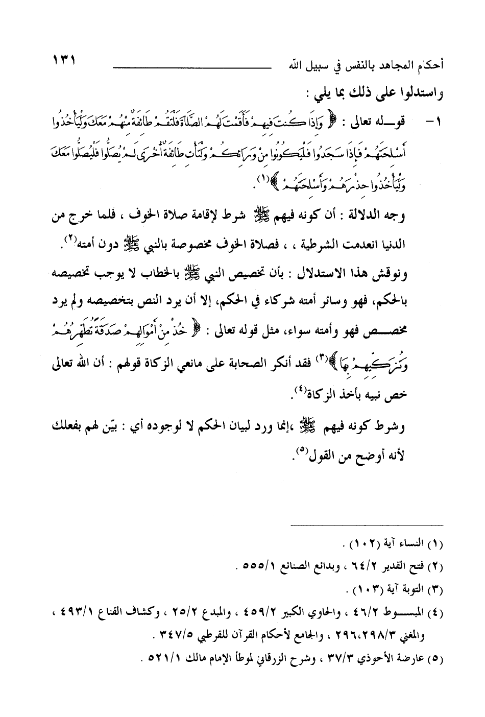 1- قوله تعالى: {وَإِذَا كُنْتَ فِيهِمْ فَأَقَمْتَ لَهُمُ الصَّلاةَ فَلْتَقُمْ طَائِفَةٌ مِنْهُمْ مَعَكَ وَلْيَأْخُذُوا أَسْلِحَتَهُمْ فَإِذَا سَجَدُوا فَلْيَكُونُوا مِنْ وَرَائِكُمْ وَلْتَأْتِ طَائِفَةٌ أُخْرَى لَمْ يُصَلُّوا فَلْيُصَلُّوا مَعَكَ وَلْيَأْخُذُوا حِذْرَهُمْ وَأَسْلِحَتَهُمْ} [النساء: 102] .