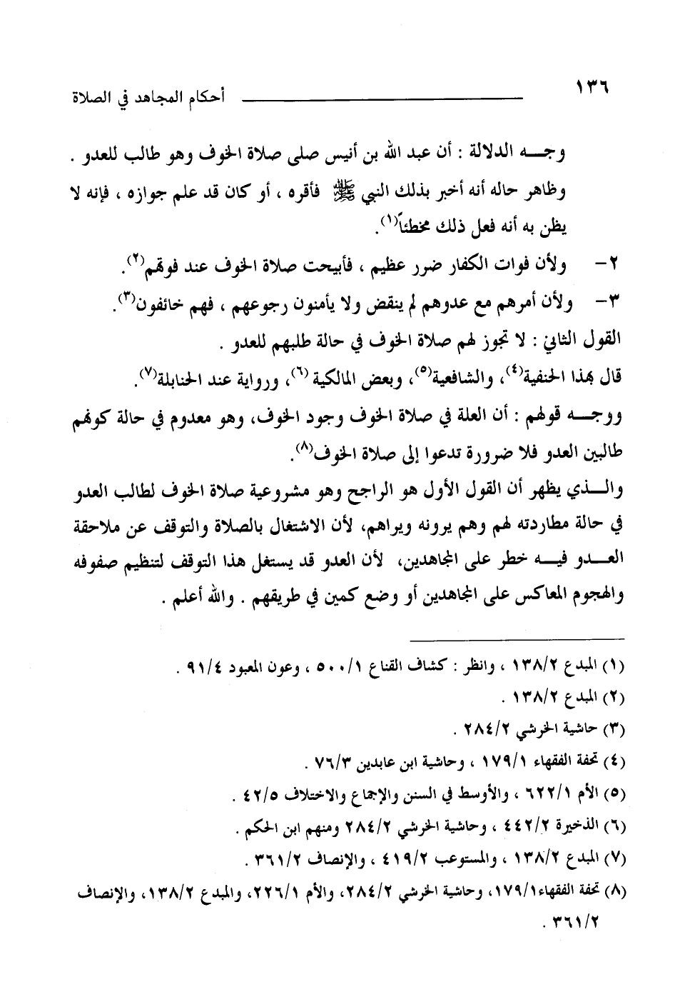 ووجه قولهم: أن العلة في صلاة الخوف وجود الخوف وهو معدوم في حالة كونهم طالبين العدو فلا ضرر تدعوا إلى صلاة الخوف (¬8) .