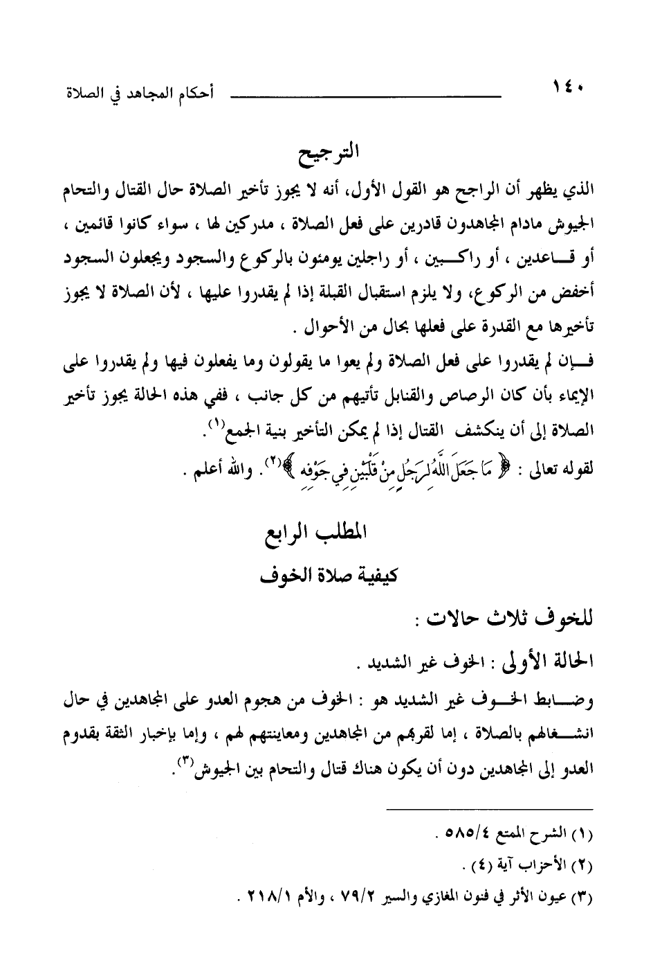 الذي يظهر أن الراجح هو القول الأول، أنه لا يجوز تأخير الصلاة حال القتال والتحام الجيوش ما دام المجاهدون قادرين على فعل الصلاة، مدركين لها، سواء كانوا قائمين، أو قاعدين، أو راكبين، أو راجلين يومئون بالركوع والسجود ويجعلون السجود أخفض من الركوع، ولا يلزم استقبال القبلة إذا لم يقدروا عليها لأن الصلاة لا يجوز تأخيرها مع القدرة على فعلها بحال من الأحوال.