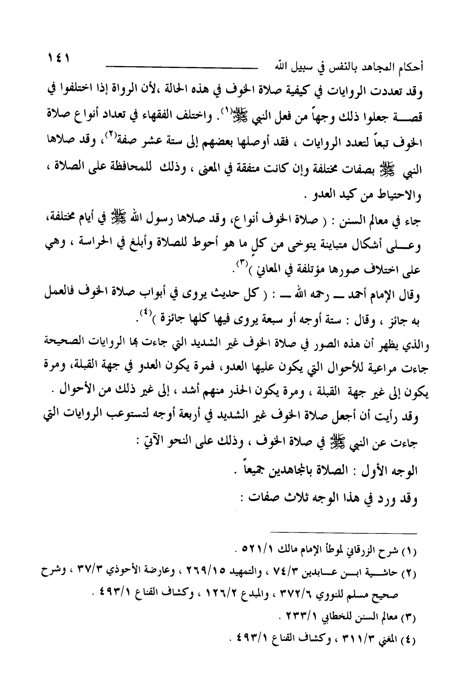 وقد رأيت أن أجعل صلاة الخوف غير الشديد في أربعة أوجه لتستوعب الروايات التي جاءت عن النبي - صلى الله عليه وسلم - في صلاة الخوف وذلك على النحو الآتي: