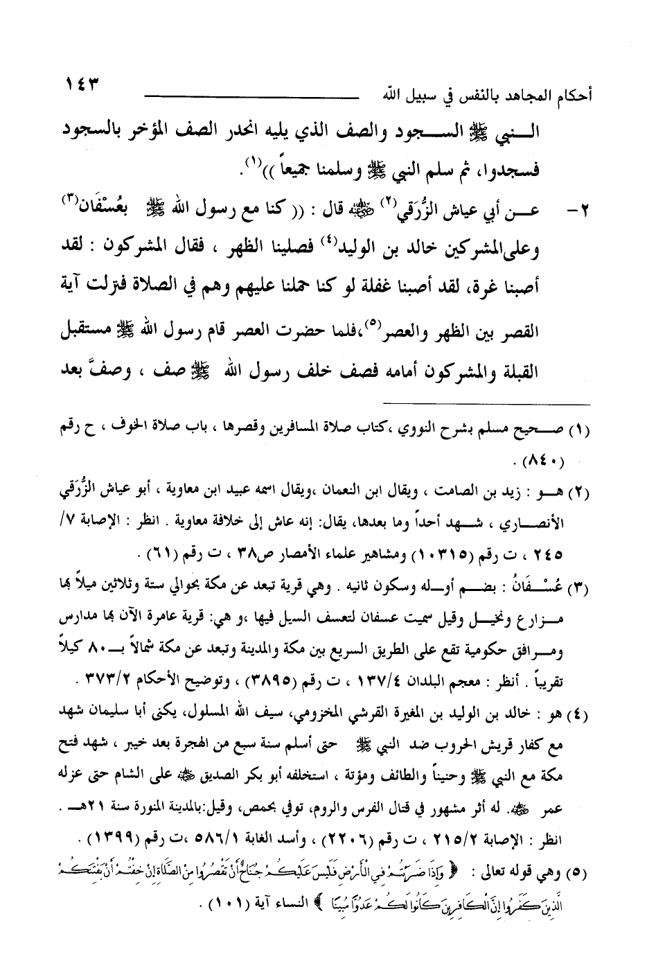 2-عن أبي عياش الزرقي - رضي الله عنه - (¬2) قال: (كنا مع رسول الله - صلى الله عليه وسلم - بعسفان (¬3) وعلى المشركين خالد بن الوليد (¬4) فصلينا الظهر، فقال المشركون: لقد أصبنا غرة، لقد أصبنا غفلة لو كنا حملنا عليهم وهم في الصلاة فنزلت آية القصر بين الظهر والعصر (¬5)