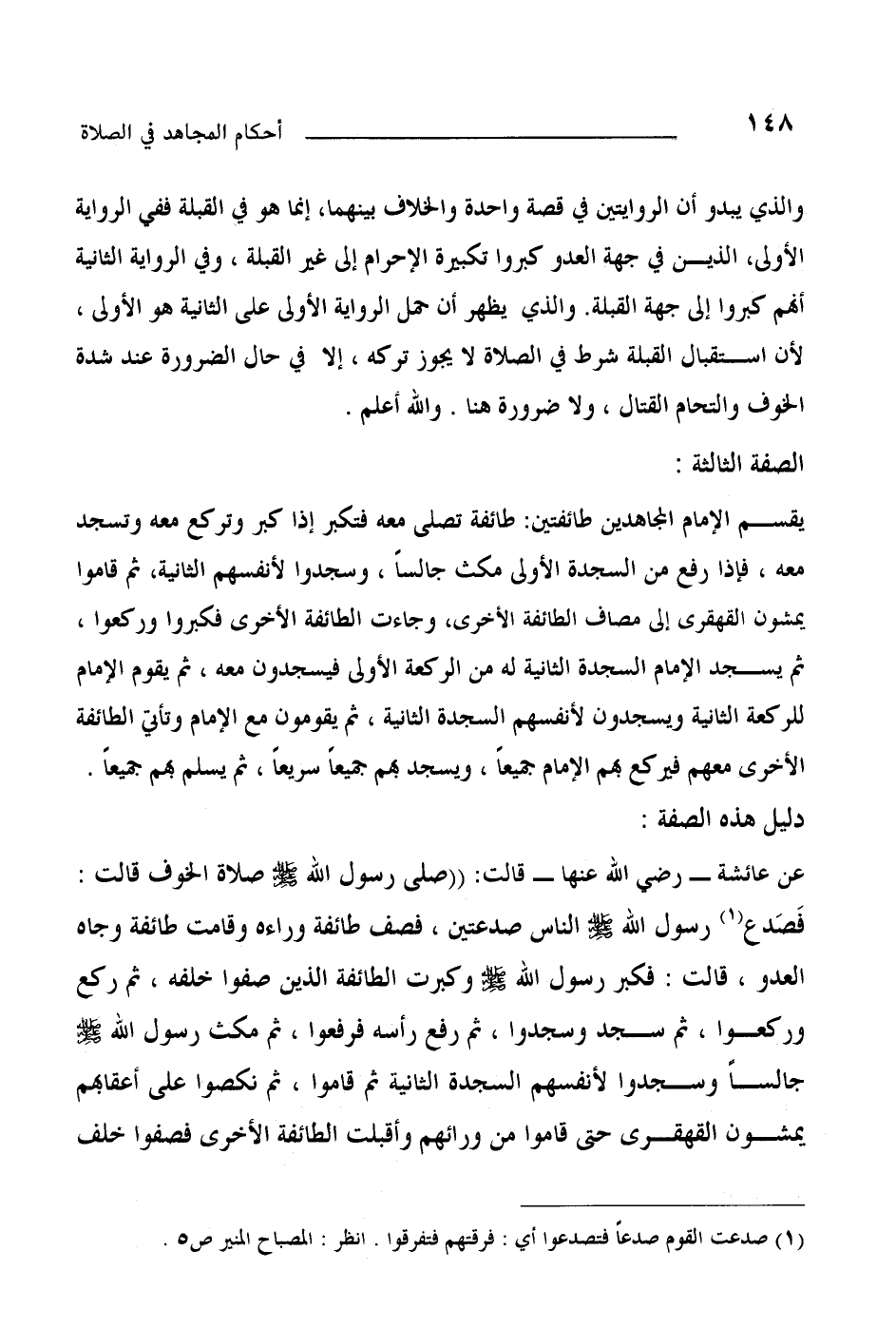 عن عائشة رضي الله عنها قالت (صلى رسول الله - صلى الله عليه وسلم - صلاة الخوف قالت: فصدع (¬1) رسول الله - صلى الله عليه وسلم - الناس صدعتين، فصف طائفة وراءه وقامت طائفة وجاه العدو، قالت: فكبر رسول الله - صلى الله عليه وسلم - وكبرت الطائفة الذين صفوا خلفه، ثم ركع وركعوا ثم سجد وسجدوا ثم رفع رأسه فرفعوا ثم مكث رسول الله - صلى الله عليه وسلم - جالسا وسجدوا لأنفسهم السجدة الثانية ثم قاموا ثم نكصوا على أعقابهم يمشون القهقرى حتى قاموا من ورائهم وأقبلت الطائفة الأخرى فصفوا خلف