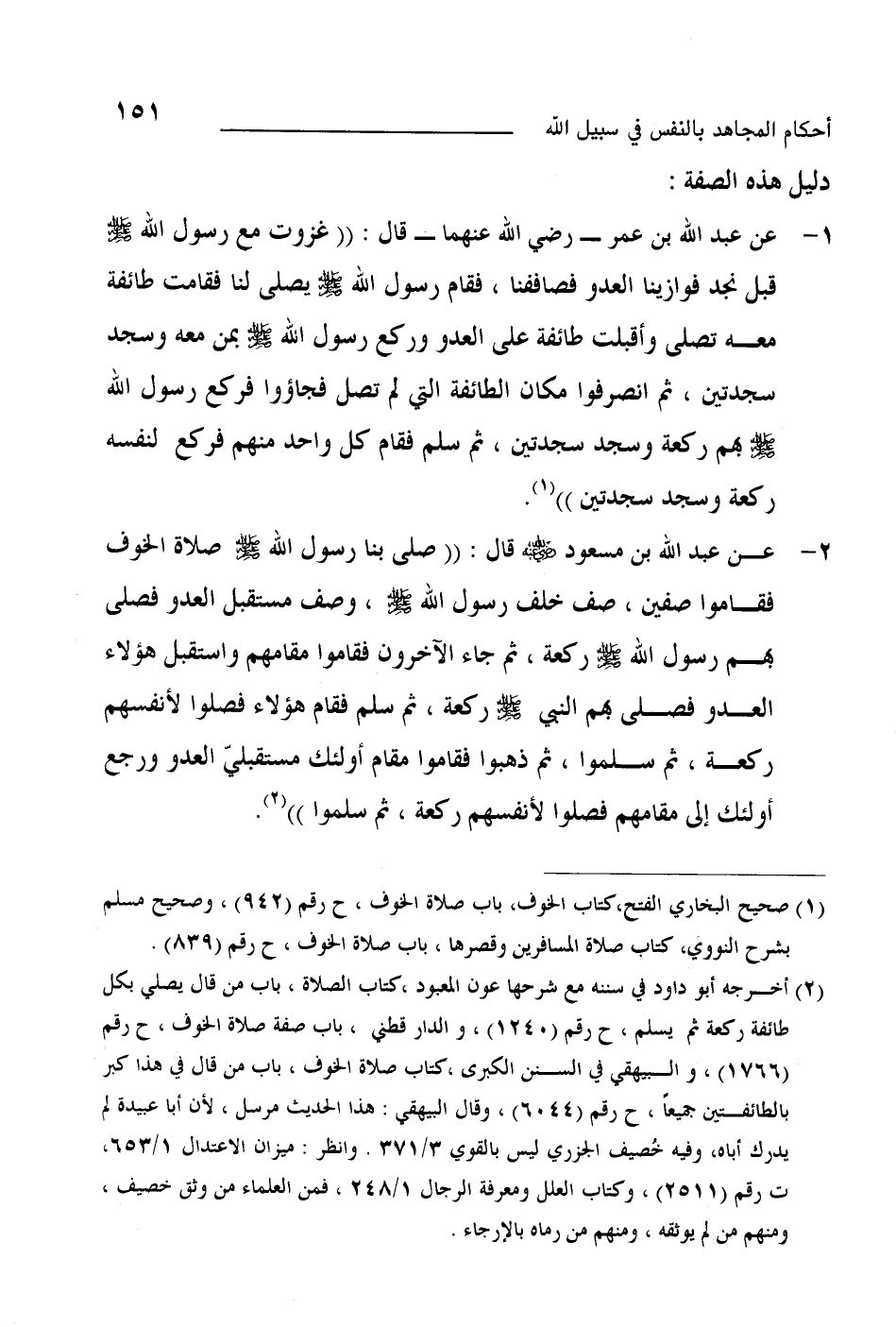 (¬1) صحيح البخاري الفتح، كتاب الخوف، باب صلاة الخوف، ح رقم (942) وصحيح مسلم بشرح النووي، كتاب صلاة المسافرين وقصرها، باب صلاة الخوف، ح رقم ... (839) .