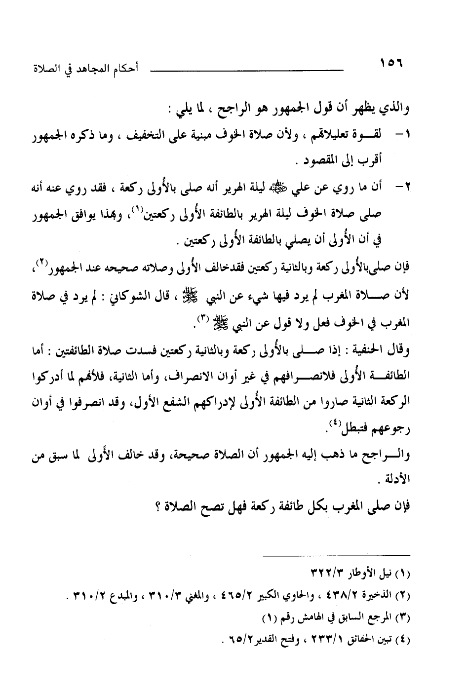 2- أن ما روي عن علي رضي الله عنه ليلة الهرير أنه صلى بالأولى ركعة، فقد روي عنه أنه صلى صلاة الخوف ليلة الهرير بالطائفة الأولى ركعتين (¬1) وبهذا يوافق الجمهور في أن الأولى أن يصلي بالطائفة الأولى ركعتين.
