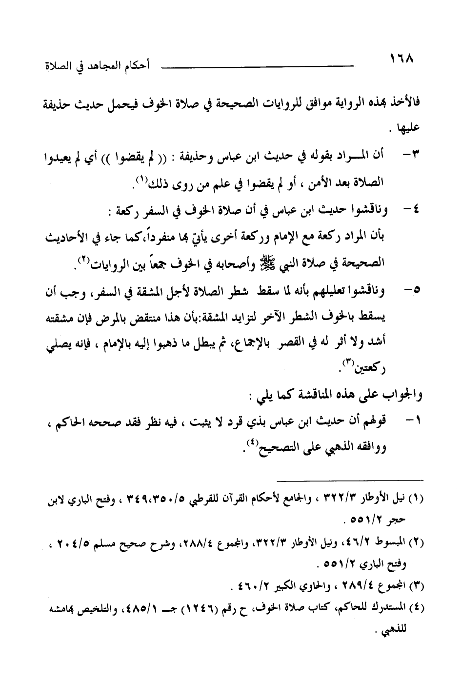 4- وناقشوا حديث ابن عباس في أن صلاة الخوف في السفر ركعة: بأن المراد ركعة مع الإمام وركعة أخرى يأتي بها منفردا كما جاء في الأحاديث الصحيحة في صلاة النبي - صلى الله عليه وسلم - وأصحابه في الخوف جمعا بين الروايات (¬2) .