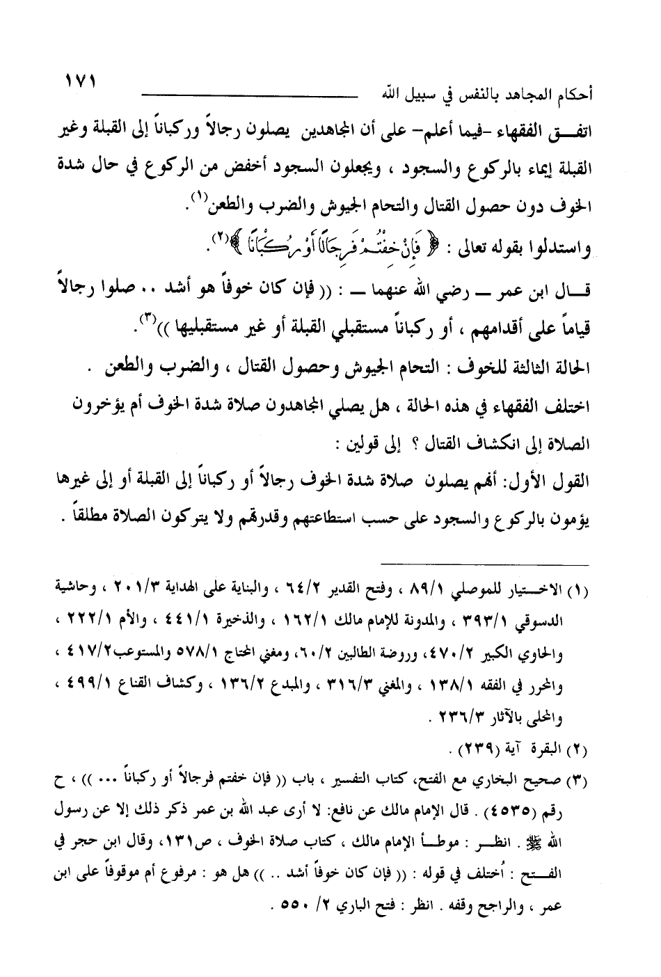 قال ابن عمر رضي الله عنهما (فإن كان خوفا هو أشد.. صلوا رجالا قياما على أقدامهم، أو ركبانا مستقبل القبلة أو غير مستقبليها) (¬2) .