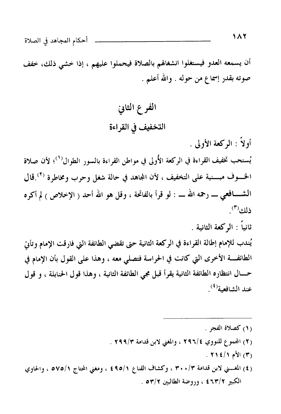 يستحب تخفيف القراءة في الركعة الأولى في مواطن القراءة بالسور الطوال (¬1) لأن صلاة الخوف مبنية على التخفيف، لأن المجاهد في حالة شغل وحرب ومخاطرة (¬2) قال الشافعي رحمه الله لو قرأ بالفاتحة وقل هو الله أحد (الإخلاص) لم أكره ذلك (¬3) .