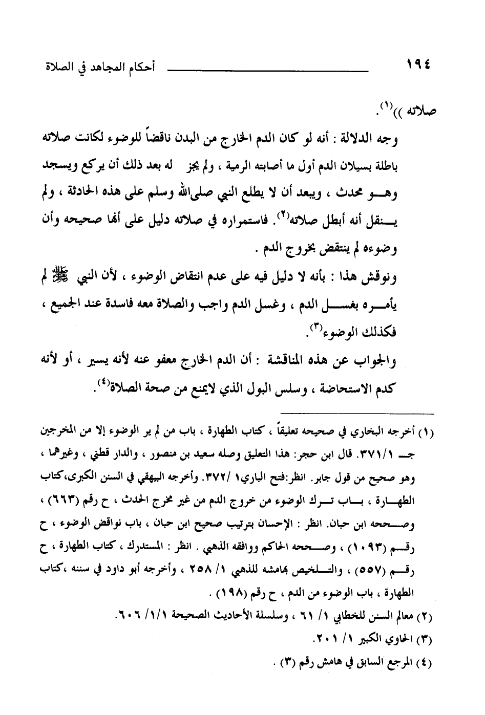 (¬1) أخرجه البخاري في صحيحه تعليقا، كتاب الطهارة باب من لم ير الوضوء إلا من المخرجين ج (1/371) قال ابن حجر: هذا التعليق وصله سعيد بن منصور، والدارقطني وغيرهما وهو صحيح من قول جابر. انظر: فتح الباري (1/372) وأخرجه البيهقي في السنن الكبرى كتاب الطهارة باب ترك الوضوء من خروج الدم من خروج الدم من غير مخرج الحدث ح رقم (663) وصححه ابن حبان. انظر: الإحسان بترتيب صحيح ابن حبان، باب نواقض الوضوء، ح رقم (1093) وصححه الحاكم ووافقه الذهبي انظر المستدرك كتاب الطهارة ح رقم (557) والتلخيص بهامشه للذهبي ... (1/258) وأخرجه أبو داود في سننه كتاب الطهارة باب الوضوء من الدم ح رقم (198) .