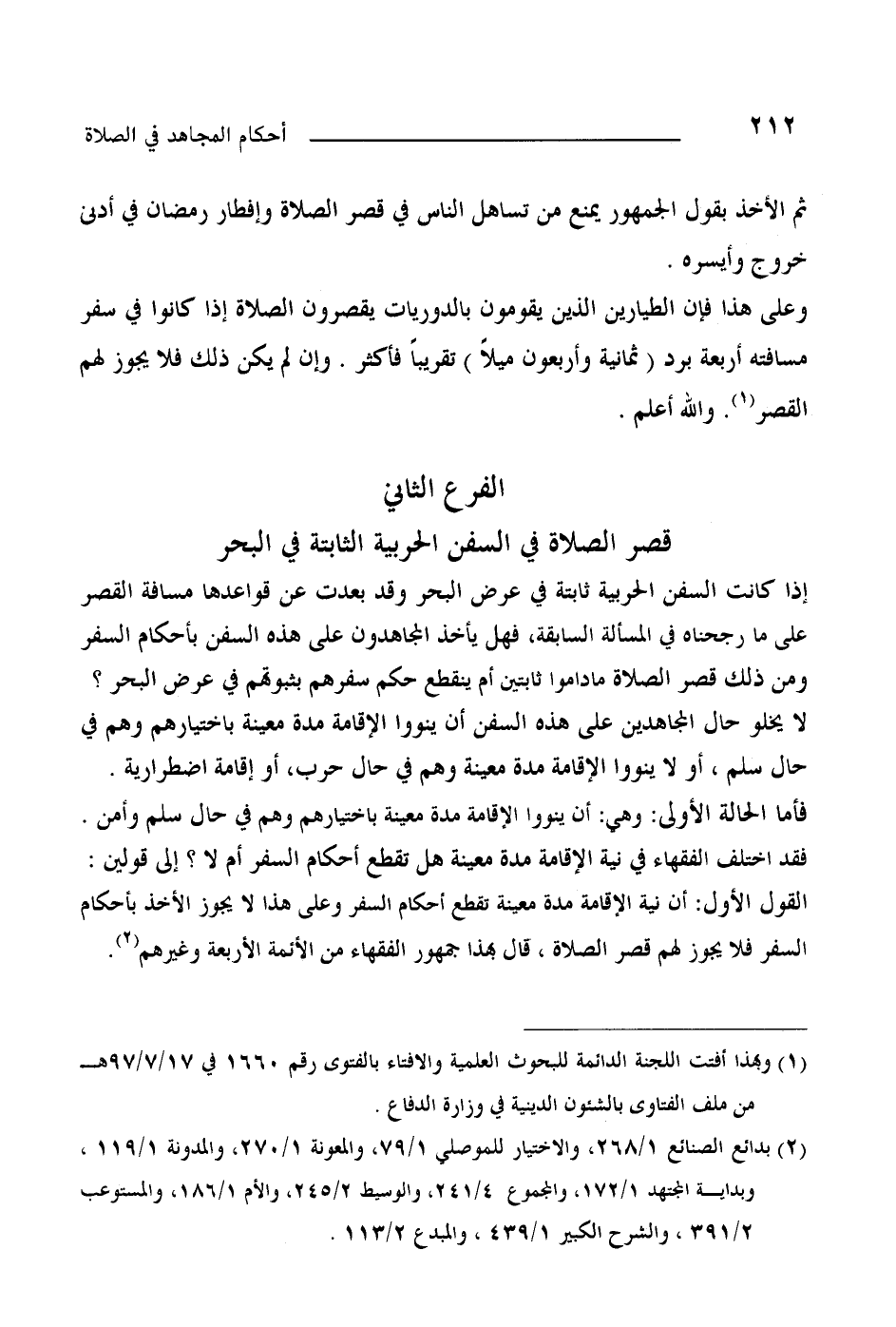 إذا كانت السفن الحربية ثابتة في عرض البحر وقد بعدت عن قواعدها مسافة القصر على ما رجحناه المسألة السابقة، فهل يأخذ المجاهدون على هذه السفن بأحكام السفر ومن ذلك قصر الصلاة ما داموا ثابتين أم ينقطع حكم سفرهم بثبوتهم في عرض البحر؟ لا يخلو حال المجاهدين على هذه السفن أن ينووا الإقامة مدة معينة باختيارهم وهم في حال سلم، أو لا ينووا الإقامة مدة معينة وهم في حال حرب، أو إقامة اضطرارية.