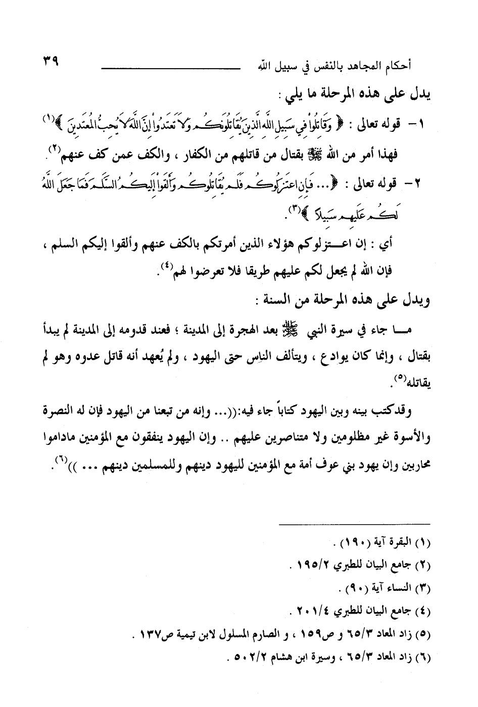 1- قوله تعالى: {وَقَاتِلُوا فِي سَبِيلِ اللَّهِ الَّذِينَ يُقَاتِلُونَكُمْ وَلا تَعْتَدُوا إِنَّ اللَّهَ لا يُحِبُّ الْمُعْتَدِينَ} [البقرة: 190] .