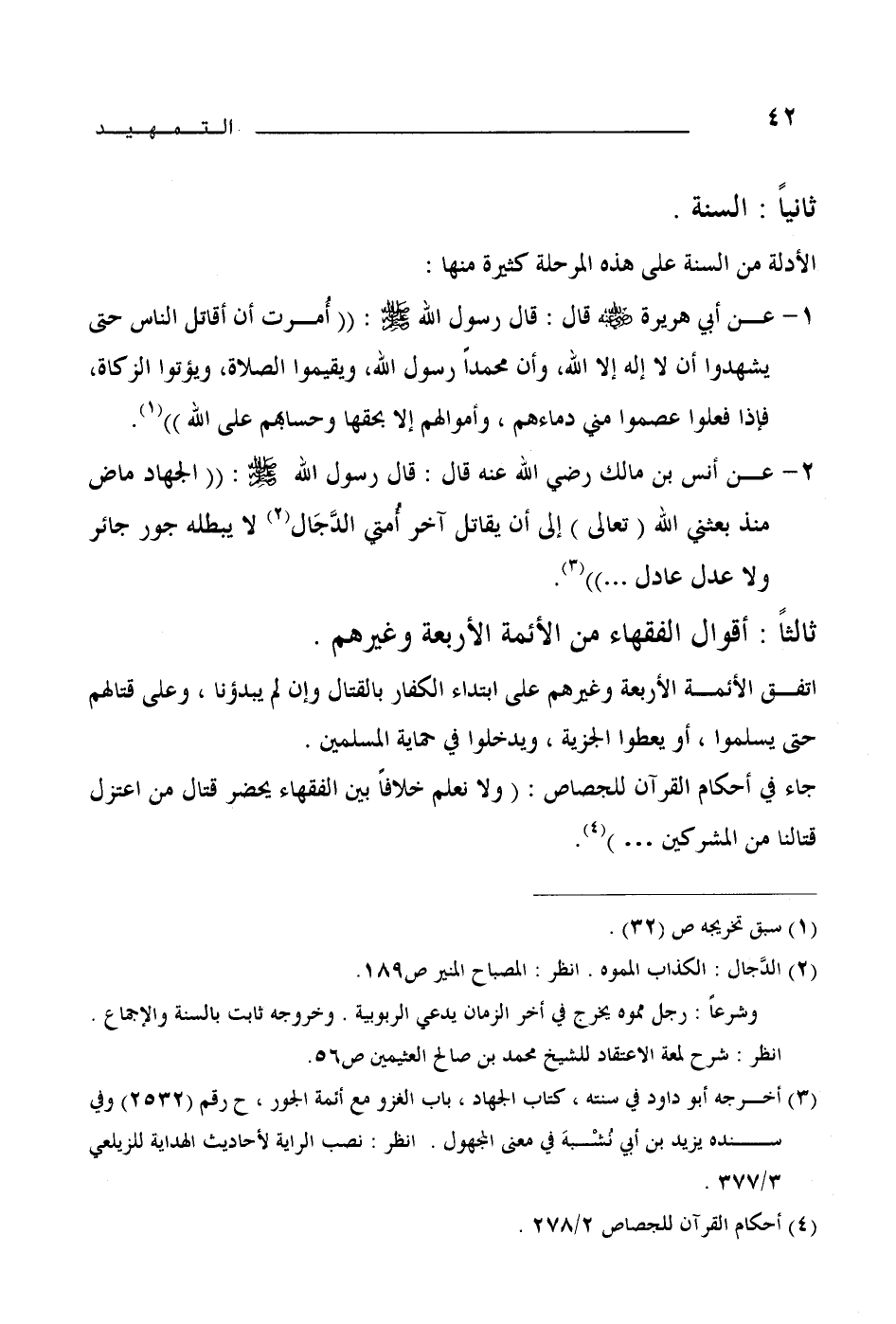 2- عن أنس بن مالك رضي الله عنه قال: قال رسول الله - صلى الله عليه وسلم - «الجهاد ماض منذ بعثني الله تعالى إلى أن يقاتل آخر أمتي الدجال (¬2) لا يبطله جور جائر ولا عدل عادل..» (¬3) .