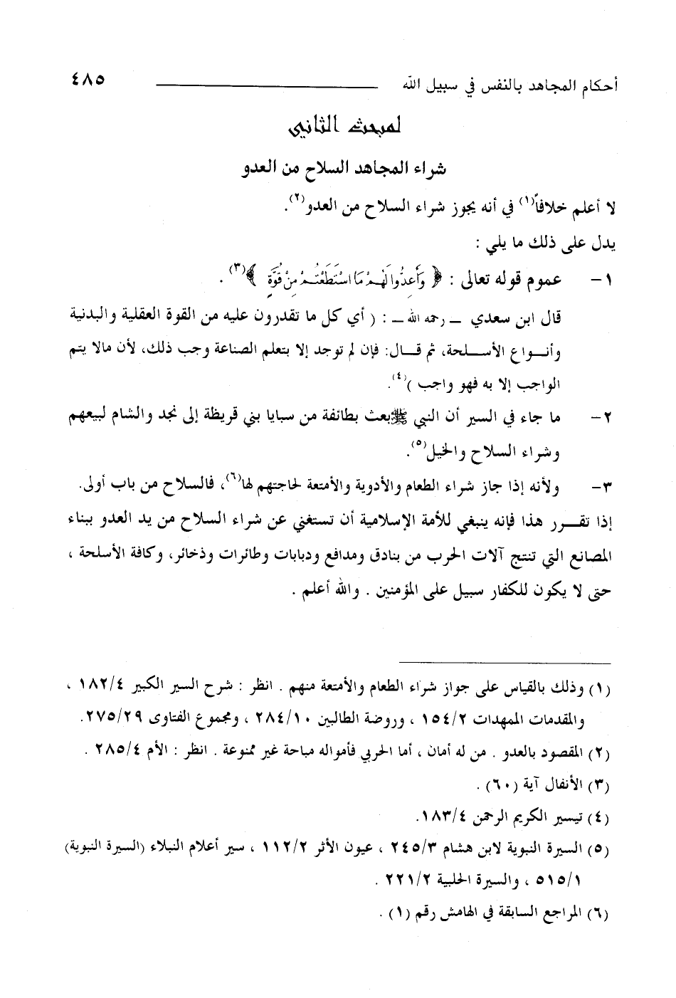 3- ولأنه إذا جاز شراء الطعام والأدوية والأمتعة لحاجتهم لها (¬5) فالسلاح من باب أولى. إذا تقرر هذا فإنه ينبغي للأمة الإسلامية أن تستغني عن شراء السلاح من يد العدو ببناء المصانع التي تنتج آلات الحرب من بنادق ومدافع ودبابات وطائرات وذخائر، وكافة الأسلحة، حتى لا يكون للكفار سبيل على المؤمنين. والله أعلم.