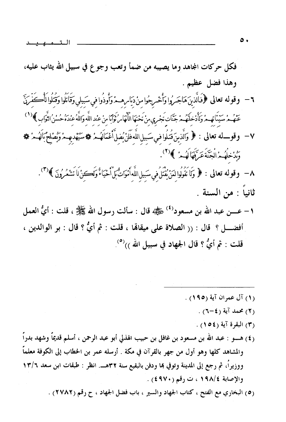 1-عن عبد الله بن مسعود (¬1) رضي الله عنه قال: سألت رسول الله - صلى الله عليه وسلم - قلت: أي العمل أفضل؟ قال: «الصلاة على ميقاتها» قلت: ثم أي؟ قال: «بر الوالدين» قلت: ثم أي؟ قال: «الجهاد في سبيل الله» (¬2) .
