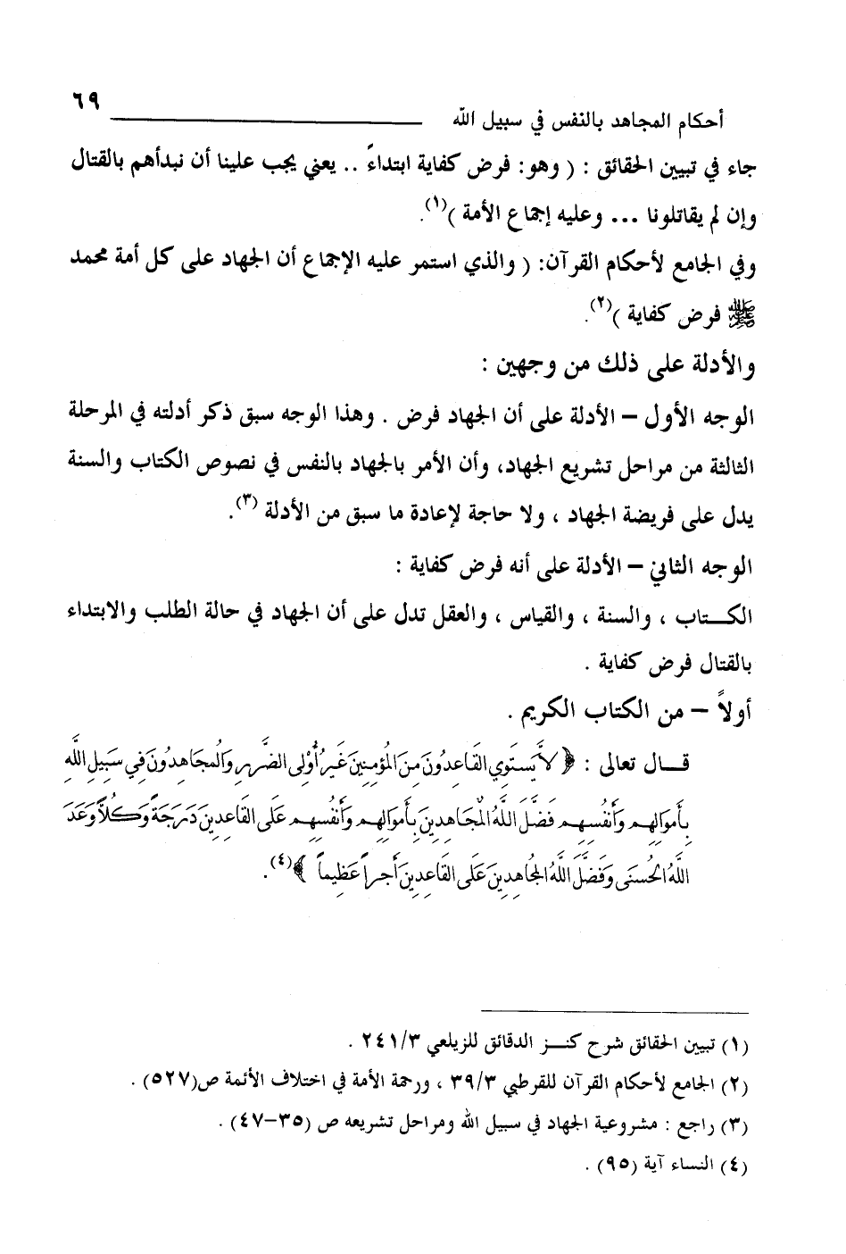 قال تعالى: {لا يَسْتَوِي الْقَاعِدُونَ مِنَ الْمُؤْمِنِينَ غَيْرُ أُولِي الضَّرَرِ وَالْمُجَاهِدُونَ فِي سَبِيلِ اللَّهِ بِأَمْوَالِهِمْ وَأَنْفُسِهِمْ فَضَّلَ اللَّهُ الْمُجَاهِدِينَ بِأَمْوَالِهِمْ وَأَنْفُسِهِمْ عَلَى الْقَاعِدِينَ دَرَجَةً وَكُلا وَعَدَ اللَّهُ الْحُسْنَى وَفَضَّلَ اللَّهُ الْمُجَاهِدِينَ عَلَى الْقَاعِدِينَ أَجْرًا عَظِيمًا} [النساء: 95] .