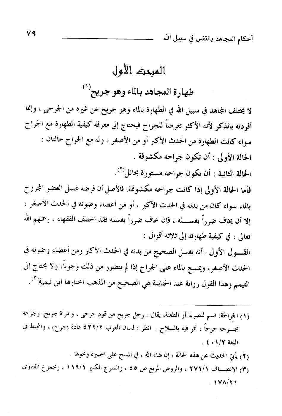 لا يختلف المجاهد في سبيل الله في الطهارة بالماء وهو جريح عن غيره من الجرحى، وإنما أفردته بالذكر لأنه الأكثر تعرضا للجراح فيحتاج إلىمعرفة كيفية الطهارة مع الجراح سواء كانت الطهارة من الحدث الأكبر أو من الأصغر، وله مع الجراح حالتان: