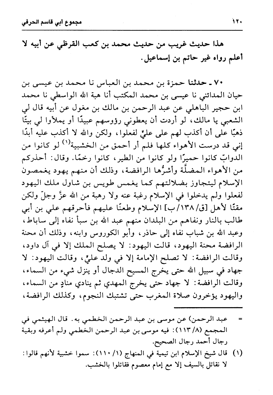 70- حدثنا حَمْزَةُ بْنُ مُحَمَّدِ بْنِ الْعَبَّاسِ حدثنا محمد بن عيسى بن حيان المدائني حدثنا عيسى بن محمد المكتب أنا هبة الله الواسطي حدثنا محمد بن حجير الباهلي عن عبد الرحمن بن مالك بن مغول عن أبيه قال قال لي الشعبي يا مالك لو أردت أن يعطوني رؤوسهم عبيدا أو يملأوا لي بيتا ذهبا على أن أكذب لهم على علي لفعلوا ولكن والله لا أكذب عليه أبدا إني قد درست الأهواء كلها فلم أرى أحمق من الخشبية لو كانوا من الدواب كانوا حميرا ولو كانوا من الطير كانوا رخما وقال أحذركم من الأهواء المضلة وأشرها الرافضة وذلك أن منهم يهود يغمصون الإسلام ليتجاوز بضلالتهم كما يغمس طويس بن شاول ملك اليهود لفعلوا ولم يدخلوا في الإسلام رغبة عنه ولا رهبة من الله عز وجل ولكن مقتا لأهل الإسلام وطعنا عليهم فأحرقهم علي بن أبي طالب بالنار ونفاهم من البلدان منهم عبد الله بن سبأ نفاه إلى ساباط وعبد الله بن شباب نفاه إلى حاذر وأبو الكوروس وابنه