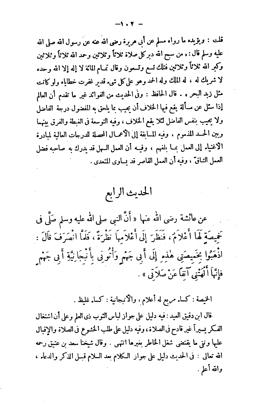 قال ابن دقيق العيد: فيه دليل على جواز لباس الثوب ذي العلم، وعلى أن اشتغال الفكر يسيرًا غير قادح في الصلاة، وفيه دليلٌ على طلب الخشوع في الصلاة والإقبال عليها، ونفي ما يقتضي شغل الخاطر بغيرها، انتهى.