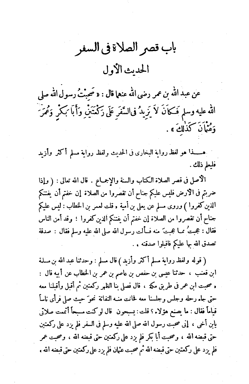 عن عبد الله بن عمر - رضي الله عنهما - قال: "صحبت رسول الله - صلى الله عليه وسلم - فكان لا يزيد في السفر على ركعتين وأبا بكر وعمر وعثمان كذلك".